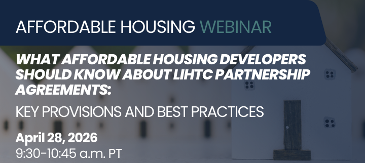 Miller Nash’s Affordable Housing team invites you to a complimentary legal webinar focused on Low-Income Housing Tax Credit (LIHTC) partnership agreements and related documents and agreements. Join our experienced attorneys as we explore fundamental contractual provisions and practical considerations that shape successful partnerships in affordable housing development. Drawing on current industry trends and real-world experience, this session will provide actionable guidance for developers, counsel, funders, and other stakeholders working in today’s complex affordable housing landscape.