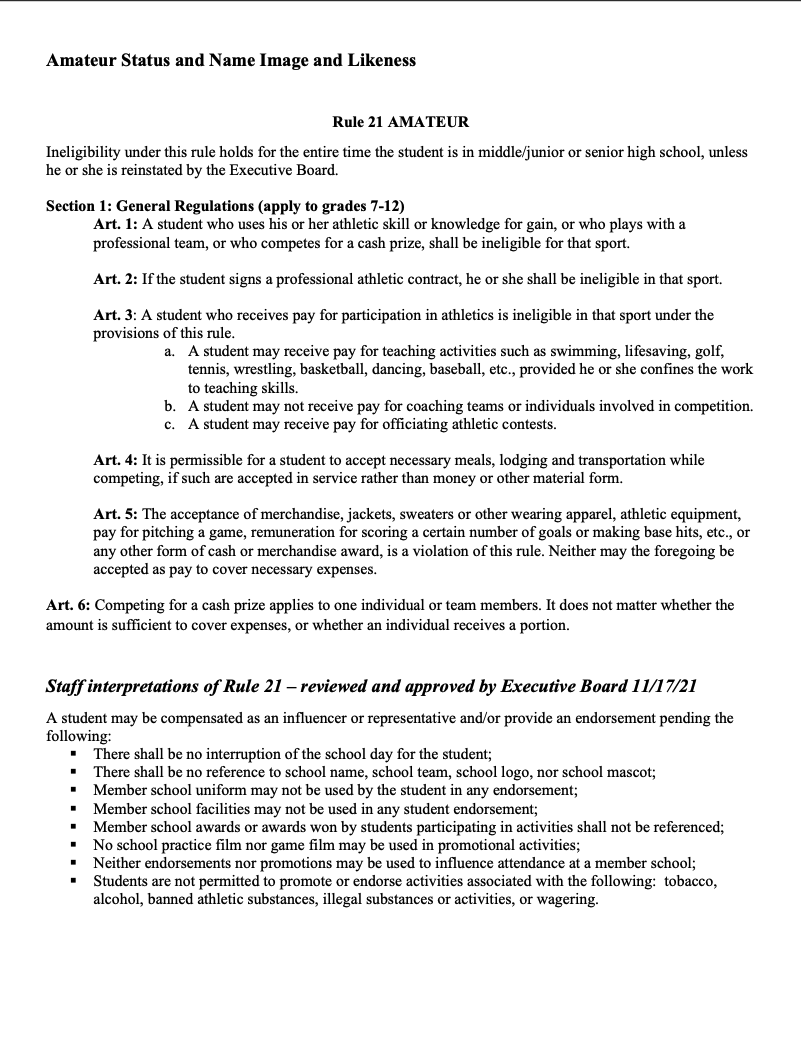 Since the formation of the NCAA in the 1900s, amateur athletes or student-athletes (as coined by Walter Byers, the NCAA’s first executive director) have been restricted by NCAA rules by not being allowed to profit off their own NIL. This bar directly affected not only college student-athletes, but also high school (and younger) athletes, since a high school athlete would likely lose their NCAA eligibility if they profited off their own NIL.