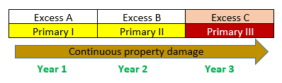 But now imagine that property damage took place over a longer period covered by three consecutive one-year policies, each with an excess policy overlying it. Graphically, the situation looks like this, with the excess policies A through C “stacked” over the primary policies I through III: